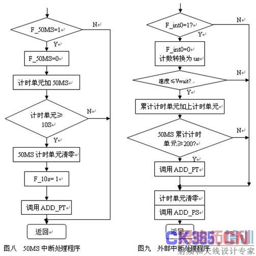 通过霍尔传感器,车轮每转动一圈,会触发外部中断,在中断子程序里首先要关定时器,存T0计数值,给定时器重新置50MS计数初值后置位F_int0并开定时器。在载客部分也会调用外部中断处理子程序,流程如图九所示,当检测到车速低于特定值时,需要计算误时价,将计时单元加入累计误时单元中,其中ADD_PS是里程价子程序。