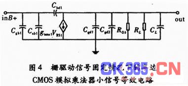 由于动态阈值NMOS晶体管M1~M4均满足VDS≥VGS-VTH(N),即M1~M4均工作在饱和区,但是必须考虑gmbs的影响。图3所 示的低压低功耗CMOS模拟乘法器的等效小信号等效电路如图4所示,条件是栅驱动信号VinA+和VinA-是暂时固定的,其中只表示了M1和M2晶体 管,此时动态阈值NMOS的跨导为gmbs,而实际的动态阈值NMOS会>gmbs。由图4,也可以直接获得M3和M4的小信号等效电路。联立 M1~M4的等效电路可知,文中低压CMOS模拟乘法器的最小转换增益如式(9)所示,即实际转换增益大于式(9)。由图4所示的小信号等效电路,文中低 压CMOS模拟乘法器的最小频带宽度如式(5)所示。