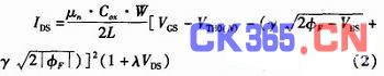 当动态阈值NMOS晶体管满足VDS≥VGS-VTH(N)时,即晶体管工作在饱和区,IDS与VGS、VBS之间的关系如式(2)所示。