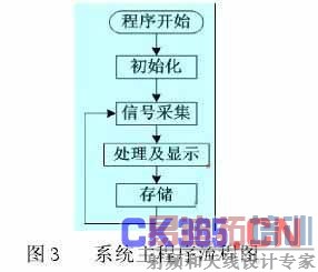 为了达到完全同时检测垂直和水平两个方向的振动信号,因此程序中分别用两个 ADC 的第一通道进行采样。A D C 转换频率最高可达 1 M H z , 在通道转换期间, A D C 能产生 D M A 请求, 使 D M A 来传输 A D C 转换值,提高了数据传输的效率[3]。DMA 自动将采集数据保存到特定的数组中, 然后程序进行数据的滤波处理运算,最后在 RCU6093W-B 液晶上实时显示出来。若要进一步分析振动数据,需要将采集的数据通过 SPI 接口保存到 SD 卡内。程序主流程图如图 3 所示。其中初始化包括系统初始化,DMA、ADC 和 SPI 初始化。只要系统一上电,程序就会持续地开始采集、处理、显示及存储。