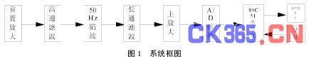本系统的硬件结构如图1所示,首先从被测对象提取微弱的心电信号,滤除干扰信号后进行放大,把取得的模拟信号送入AD转换器,通过单片机控制进行定时采样,并把数据及时送给LCD显示。该系统主要有一下几个模块。