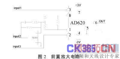 (1)采用单导联三电极方式,左右手为差动输入,右腿提供共模驱动信号。前置放大电路采用ADI公司的AD620仪表放大器,该放大器共模抑制比高,低噪声。为了确保AD620低噪声性 能,需要在AD620的1脚和8脚之间接一精密电阻构成需要的增益。基本电路如图2所示。