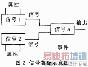 ATLAS 2K模型的复合信号组件库与ATLAS的EXTEND功能类似,通过定义基本信号组件产生的复合信号和使用这些信号的规则,实现了对信号的扩展。图2给出了由基本信号组件1和2实现复合信号n的示意图。复合信号组件可以仿真复杂信号,如射频(RF)信号、数据总线信号等。