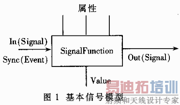 图1给出了用SMML语言构建的类名为SignalFunction的信号基类模型。SMML源于Haskell Function Language,提供了用于描述信号属性和方法的机制,通过制定语法规则和大量预定义动作来实现对信号类的定义。通常情况下,信号基类包括信号输入端(In)、事件输入端(Sync)、信号输出端(Out)、控制参数输入端(属性)、被测信号输出端(Value)等功能接口。当然,不同类型的信号也可以包括不同的接口,如激励信号类可以没有In接口、Value只对传器信号有效等。