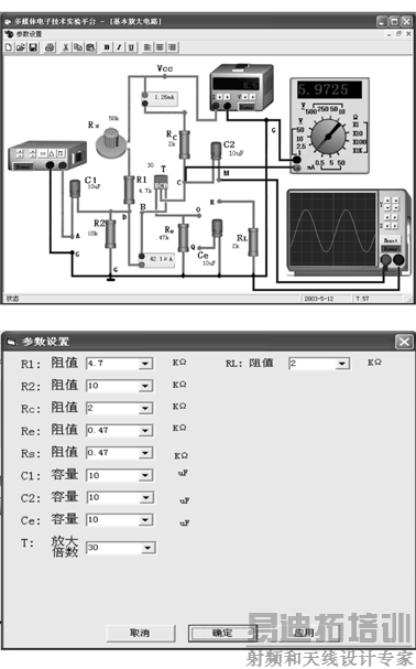 现以“单管基本电压放大器”为例,说明具体实验在虚拟实验室中是怎样开展的。实验中进行了一系列参数设置、波形观察和数据读取,以验证虚拟实验的可操作性。