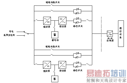数据通信设备与电信设备融合的局(站),要求交流和直流电源的负载的比例,取决于具体局(站)设备的配置,在因特网主机和基于服务器的局(站),需要交流供电的负载较多,一般可采用以UPS为基础的混合分布冗余UPS电源系统。在交流负载较少的局(站),可采用交流和直流负载公用-48V母线的混合系统。