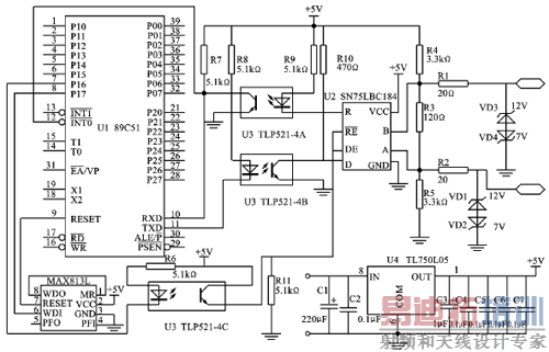 此外,电路中还有1片看门狗MAX813L,能在节点发生死循环或其他故障时,自动复位程序,交出RS-485总线控制权。这样就能保证整个系统不会因某一节点发生故障而独占总线,导致整个系统瘫痪。