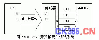 下面以S3CEV40开发板[4]为例,介绍ARM调试结构应用。S3CEV40采用的CPU为Samsung公司的S3C44B0X,是国内应用广泛的基于ARM7TDMI内核的SoC。其调试系统的硬件结构如图2: