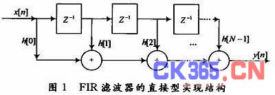 式中:h(n)表示滤波器的系数;x(i)表示带有时间延迟的输入序列,此表达式对应的直接型实现结构可用图1来表示。