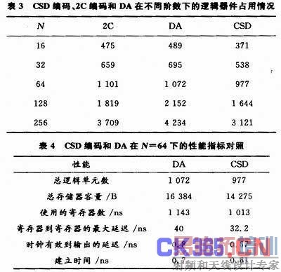为验证本文提出的算法的普遍性,以并行DA和2C编码方式设计了一系列阶数从16到256阶的FIR滤波器,滤波器在Altera公司的开发软件Max+PlusⅡ中进行编译和布局布线,采用的目标器件为EPF10K40芯片,在系统中对3种实现结构进行测试,测试数据位宽为8位。通过表3的比较结果可以看出,使用CSD编码,资源耗用明显下降。当FIR阶数很高,系数很复杂时,CSD编码的优势会更加显著。表4给出了N=64时DA算法和CSD算法的具体性能指标,从结果来看,CSD编码相对于单纯的DA在系统资源和整个系统延迟上有明显的提高。