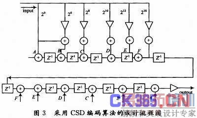 采用转置形式的FIR滤波器结构,此结构和直接型结构不同的是,输入信号X[n]是同时分别和滤波器系数向量相乘,不需要通过不同的延时单元再和相对应的滤波器系数相乘。这种结构最大的优点是工作频率较高,图3给出了采用CSD编码算法的设计流程图。