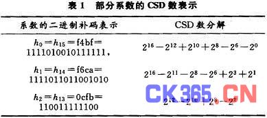 从以上式子可看出,应用CSD表示法,由于可以降低系数中非零元素的数量,因而在运算中能减少加法的次数,有利于提高运算速度和减少资源的占用。