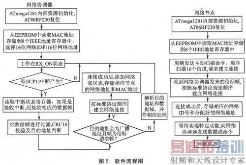 软件开发环境为AVRSTUDIO+AVRGCC。这两个软件均是免费的。软件设计主要包括射频驱动、外围电路控制和ZigBee协议栈设计3个部分。基于IEEE802.15.4协议的WPAN网络中的协调器和网络节点的软件流程基本相同,只是网络协调器要承担网络建立的功能,网络节点则要承担一些控制或测量的功能。为了与其他ZigBee产品相兼容,软件设计必须严格遵守IEEE 802.15.4协议。本设计建立的网络拓扑是非超帧结构的星形网络,具体软件流程如图5所示。