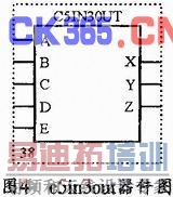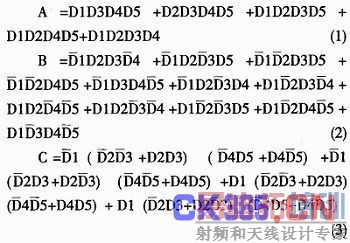 图4所示是本系统中的逻辑计算电路的c5in3out的器件图。通过c5in3out可计算出序列D6~D32的汉明距离。序列D0~D5(即图4中的A,B,C,D,E)的汉明距离可以采用逻辑函数获得。逻辑计算电路有三个二进制输出变量,由最高有效位到最低有效位依次为A、B、C(即图4中的X,Y,Z),其逻辑表达式为: