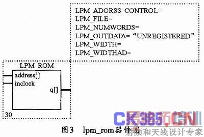 用FPGA设计汉明距离电路的另一个关键是存储器ROM,图3所示是一个lpm_rom的器件图。设计时,移位寄存器的输出作为ROM的地址输入,这样,经查找表运算后,ROM就可以输出所需的汉明数据。