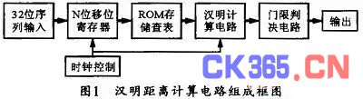 在扩频通信和数字突发通信系统中,接收机进行的数字相关检测或独特码检测,实际上就是本地一组确定序列的一位二进制数,接收机将接收到的数据连续不断的送入N位移位寄存器中,这样,任一瞬间移位寄存器中的内容即为一串二进制码,移位寄存器的输出作为ROM的地址输入,这样,经查找表运算后,ROM就可输出所需的数据,并将所得数据送入汉明计算电路以得到汉明距离,再经过门限判决输入的汉明距离。其汉明距离的计算电路框图如图1所示。