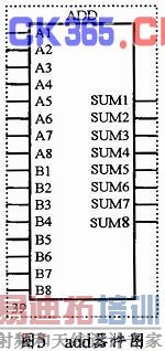 图5所示是一个汉明加法器的add器件图。add通常是采用求和网络法求和。求和网络法将ROM输出的数据两两通过一个加法器相加后,可将得出的结果再两两通过一个加法器相加,依次将各项计算结果相加在一起,其最终的累加结果便是汉明距离。
