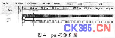 6级m序列发生器可产生周期为63的pn码序列,寄存器起始序列若为全零,输出序列也将为全零,这样会造成pn码发生器进入死锁状态。因此要使pn码发生器可以正常工作,产生预期的pn序列,必须保证在起始时寄存器中至少有一个为1。63位pn码仿真图如图4所示。