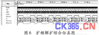 扩频解扩综合仿真图如图6所示。其中data_in为串行输入的二进制数11000110,信息码输入的时钟信号为clk,pn码发生器的时钟信号为elk1,pn是产生的63位pn码序列,data_kuo为扩频后的码序列,data_jie解扩后的信号,实现了信号的解扩。