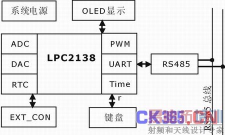 在分布式的控制系统中一般采用通用的单片机作为控制处理的核心,不仅速度慢信息处理能力弱,而且一般需要附加许多外围电路,例如RAM、ROM、ADC、DAC、看门狗等等。采用ARM微控制器LPC2138为核心的分布式控制系统,通过扩展简单的外围电路(显示模块、中断键盘、RS485模块),开发相应的嵌入式程序即可实现功能强大的系统,不仅具有较高的系统集成度和稳定性,而且开发周期比较短。本文所设计系统总体框图如图1所示,包含了OLED显示、中断键盘、RS485接口和EXT_CON接口(用来功能扩展的预留接口)。