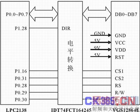 VGS12864E使用两片列驱动控制器,内嵌64×64显示数据RAM,RAM中每位数据对应屏上一个点的亮、暗,每个半屏都被分成了按行的八页,因为每个字节的数据按低位(LSB)在上,高位(MSB)在下的结构排列,所以在提取字库的时候,需要设置取字模的方式为:纵向取模,字节倒序。它与LPC2138的连接如图2所示。ARM和OLED之间需要加电平转换芯片,本设计采用16位双向电平转换芯片IDT74FCT164245,另外进行电平转换时需要进行方向控制(图2中DIR即为方向控制脚)。