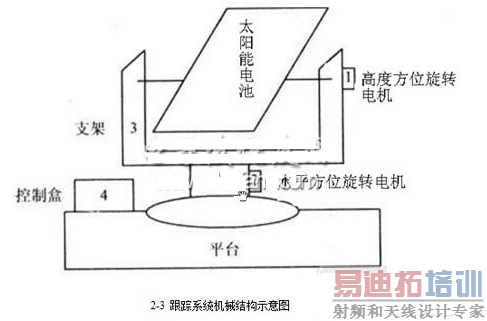 本文所设计跟踪调整装置其结构如下图所示:它主要由底座、立轴、横轴、两台旋转电机、传动齿轮等组成。其中旋转电机1驱动横轴,支撑太阳能电池板绕横轴运动,跟踪高度角运行。旋转电机2驱动水平轴,以跟踪方位角变化。
