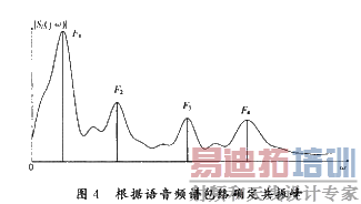 共振峰参数包括共振峰频率、频带宽度和幅值,共振峰信息包含在语音频谱的包络中。因此共振峰参数提取的关键是估计语音频谱包络,并认为谱包络中的最大值就是共振峰。利用语音频谱傅里叶变换相应的低频部分进行逆变换,就可以得到语音频谱的包络曲线。依据频谱包络线各峰值能量的大小确定出第1~第4共振峰,如图4所示。