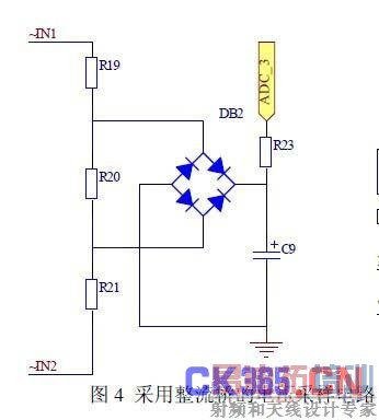 由于单片机的AD采样端口只能采样正电压,因而将所要采样的为交流电压经变压器降压、整流和分压后再采样,此时将电压限制在0V-5V之间,为了保持采样电压的精度与稳定度,在输入端口并联一个电容抗干扰,在串联一个电阻满足ADC阻抗匹配的要求。其电路图如图4所示:
