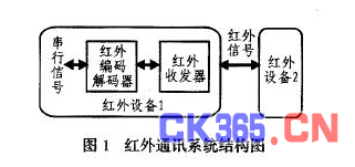 红外收发器包括发送器和接收器两部分。发送器(transmitter)将从I/O或ENDEC接收来的位调制后的脉冲转换为红外脉冲发出。接收器(receiver)检测到红外光脉冲,并将其转换为TTL或CMOS电脉冲。红外通讯系统结构如图1所示。
