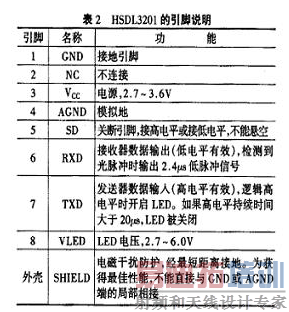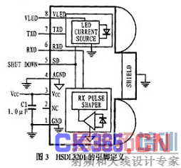 HSDL-3201是一种廉价的红外收发器模块,工作电压为2.7~3.6V。由于发光二极管的驱动电流是内部供给的恒流32mA,因此确保了连接距离符合IrDA1.2(低功耗)物理层规范。