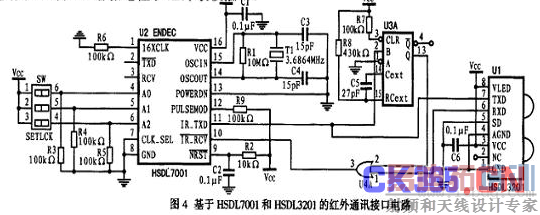 基于HSDL7001与HSDL3201的红外通讯接口电路如图4所示。其中TTL电平或COMS电平串行信号的发送与接收分别与U2 HSDL7001 的引脚2、3相连。三路编码接U2的引脚4、5、6,用来设置通讯波特率。T1为3.6864MHz晶振。C3、C4为15pF谐振电容。R1为1M谐振电阻。红外收发器U1 HSDL3201 在每发送一字节数据的同时,会将该数据通过接收器数据输出(引脚6)反馈进行校验。这个校验码对于某些通讯系统来讲意义不大,因此可采用回馈码消除电路来消除回馈校验码。图中U3是单稳态多谐振荡器,与逻辑或门 U4 组合可达到消除回馈校验码的目的。在单片机系统中,可以在发送数据的同时将串口接收中断关闭,这样就可不受回馈校验码的影响。如果需要启用该回馈码来进行校验,则可不用U3、U4,而直接将U2的引脚10、11与U1的引脚6、7相连。