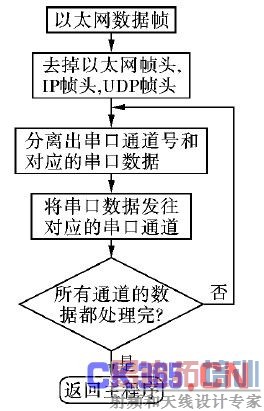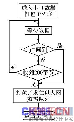 图3描述了串口接收模块的工作流程。当SC28L198中的某个接口通道接收到串口设备的一帧数据时,这些数据将被送往数据队列,同时保存相应的串口通道号。当打包时间到了规定的时间或者打包的串口数据已经达到规定的最大长度(200字节)时,该数据包将被发往以太网。图4描述了串口发送模块的工作流程。当该系统通过以太网接收到主机发来的一帧数据或命令时,ARM处理器将去掉以太网帧头、IP头和UDP头,提取出串口通道号,将分离出的串口数据帧发送到对应的串口通道。