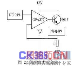 图2中,设基准源(LT1019)电压基准为Vref=2.500V,精密电阻为R=200Ω,运算放大器为精密放大器(OPA277),这样流过桥路的电流为Io=Vref/R=12.5mA。由于R为精密电阻,温度系数小于<100×10-6/℃,所以这个恒流源具有足够的精度。当某种原因,恒流源Io↓,则V-↓,而基准源具有很高的稳定性,可以认为其值不变化,于是△u↑, Io↑,使输出恒流源基本稳定。这种方法的优点是可以在较大范围内调整恒流源,负反馈使输出相对稳定;缺点是对电阻R的精密要求很高,同时要求一个低噪音低失调的精密放大器,一个初始精度高,低温漂的电压基准,增加了产品的成本。