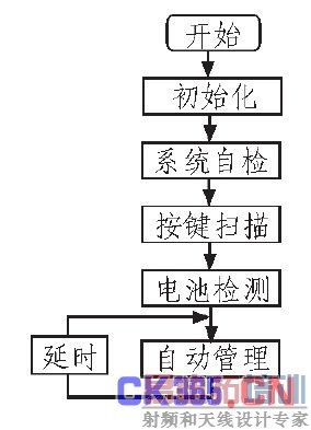 系统的软件由监控程序、自动管理程序、系统自检子程序、电池检测子程序、手工切换中断子程序、按键及数码管扫描子程序等组成。系统开始工作后,首先调用系统自检子程序,若系统或某个模块工作不正常,系统在发出报警声的同时,数码管闪烁显示故障模块代码。若系统及各模块均工作正常,则系统调用电池检测子程序,对系统各电池单体的故障、反接以及空载情况进行检查判断,并同步显示所检测电池单体的位置代码,对检测到的故障电池和反接电池进行指示报警。等所有电池检测完毕,系统自动进入电池自动管理程序,对电池进行自动循环充放电管理。在自动管理程序中,系统先对电池进行放电,放电到终止电压后再进行充电。同时在充电的过程中,利用软件延时,使镍镉充电电池在充电间隙进行短暂放电,从而以脉冲充电方式,有效地提高电池充电效率,最大限度地消除镍镉充电电池可能出现的极化现象。系统工作流程图如图6 所示。