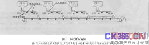 其大概的设计流程如图1所示:在图中所示总共有4个物料斗,分别装有四种不同的物料,它们各自配备一套称量装置。黑色的方块表示两个称重传感器,黑色的圆环表示速度传感器,而另外所要指出的是如图所示的“叶片控制阀”,且都有各自的变速电动机直接驱动由各自的分机控制。