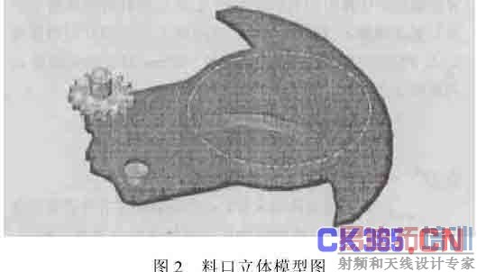 为能有效的控制料口的大小,采用圆形出料口,双叶片,通过齿轮使两叶片同时运动。用SolidWorks做的立体模型如图2所示(为了说明是两片不同的叶片所以采用了两种不同的颜色,其实它们的材料的完全一样的。虚线圈表示料口的位置,黄色的齿轮是用来传递动力的,且它和黑色的叶片相对固定。而两叶片之间也通过齿轮传动,实现同时运动。上片有斜切面是考虑方便截断用的,而下片的最外边设有挡边,为防止会有物料落入装置)。