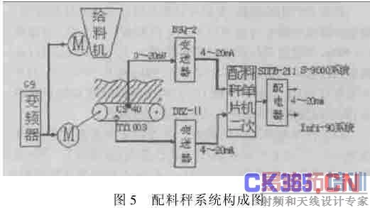 为了实施自动配料,提高配料精度以及降低劳动强度,配料秤皮带应该为可调速皮带。可以使用富士G9型变频器同时实现控制配料秤皮带和片叶式给料机的开闭。配料秤选用了载重传感器TY1003型、速度传感器选择CS-40型,他们分别配智能变送器DBZ-II及变送器BSQ-2,秤的二次表用8031单片机设计。二次表的一路瞬时量输出4~20mA电流信号经配电器SDBT-211隔离后,分两路分别进入S-9000系统和Infi-90系统。系统的示意图如图5所示。