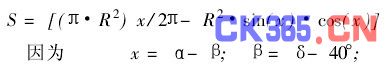 在系统运行中最常用的就是1.4t/h,也就是开口基本上是在半开的情况下工作的。具体的步进电动机的转角与开口的大小之间的联系,当带动齿轮转动40°(设计值)时为全开;设转动X°时为半开,通过几何分析可以得到它的解。其计算方法如下:虚线圈面积为(即料口全开)。