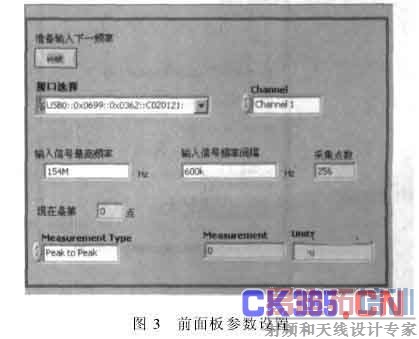 该示波器的带宽为40 MHz,选择它的扫频范围为0~160 MHz,为了计算方便,共采集256个点(见图3)。