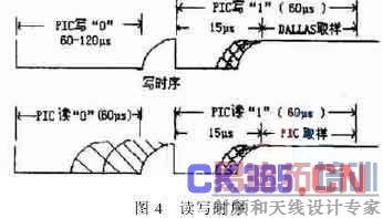 写时序:主机将数据线从高电平拉至低电平,在15μs之内将所需写的位送到数据线上,从机在15~60μs之间对数据线进行采样,整个过程持续60~120μs,再延时至少1μs之后,开始一轮新的过程(图4)。读时序:主机把数据线从高电平拉至低电平时,必须保持在低电平至少1μs,然后释放总线,从机将在15μs之内输出数据,整个过程最短持续期限为60μs,再延时至少1μs之后,开始一轮新的过程(图4)。
