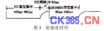 1-WIRE网络是一种具有一个总线主机和一个或若干个从机的系统。从机采用类似集电极开路的形式输出,因此要求上拉电阻。1-WARE网络的通讯协议有三种类型:初始化、读时间片和写时间片。初始化时序:主机向总线发一复位脉冲(至少480μs的低电平),然后释放总线并进入接收状态,这时总线被上拉电阻拉高,从机在检测到信号线上的上升沿之后,等待15~60μs,然后发出存在脉冲(60~240μs的低电平)(图3)。