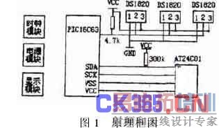 硬件调试上需要注意接口问题。DS18B20的工作电流高达1mA,当温度变换时信号线上必须提供足够的功率,因此选用了4.7k的上拉电阻。AT24C01数据线上的上拉电阻不能太大,否则AT24C01输出数据时不能获得足够的电流;也不能太小,否则AT24C01工作不稳定,必须经过调试选择一定阻值的上拉电阻。