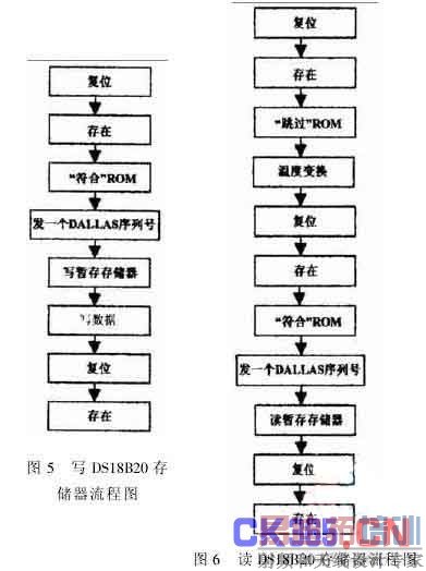 本系统对DS18B20进行的操作主要包括三个子过程:1.自动搜索3个DS18B20的序列号(程序流程略),主机首先发一复位脉冲,等收到返回的存在脉冲后,发出搜索器件的序列号命令(F0H),读取DS18B20的序列号;2.写暂存存储器(程序流程如图5),主机在收到返回的存在脉冲后,发出匹配器件的序列号命令(55H),跟着发送一DS18B20的序列号,再发送写暂存器命令(4EH),写数据;3.启动DS18B20作温度转换并读取温度值(程序流程如图6),主机在收到返回的存在脉冲后,发出跳过器件的序列号命令(CCH),跟着发出温度转换命令(44H),再次复位并收到返回的存在脉冲后,发出匹配器件的序列号命令(55H),跟着发送一DS18B20的序列号,再发送读暂存器命令(BEH),读出数据。
