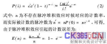 单光子计数器的误差来源主要有光子发射的统计涨落、光阴极的热电子发射和脉冲堆积效应等。而在计数率较高的情况下,由脉冲堆积效应造成的多光子响应峰将是误差的主要来源。假设每个光子进入探头是完全随机的,那么光子在1 s内进入探测器的概率可视为均匀。实验中,一般计数率n≤108,分辨时间t取10~50 ns,满足泊松分布近似条件[4]。此时,i个光子在t内出现的概率为: