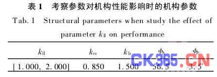 参数kll是支杆的伸缩比。为观察kll对机构性能的影响趋势,暂定其余4个参数(见表1)。