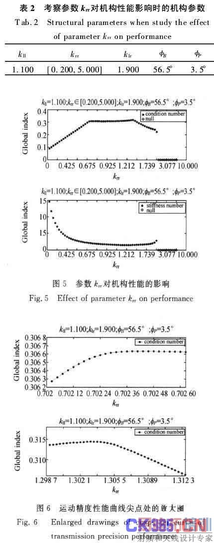 参数klr是支杆最小长度与定平台半径的比。为观察klr对机构性能的影响趋势,暂定其余4个参数(见表3)。