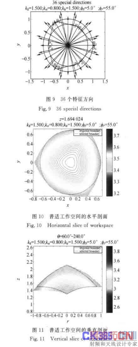 举例说明,机构参数见表5。坐标系同图2所示,平面OXY与水平面重合。选取平行于水平面的0°-180°、90°-270°、60°-240°、150°-330°、120°-300°、210°-30°等12个方向、与各支杆在水平面上的投影平行和垂直垂直的24个方向等共36个方向为特征方向(见图9)。依据Gough-Stew-art平台机构的结构特点,求解动定平台保持平行姿态时动平台在特征方向上的运动范围的交集。计算时仅考虑杆长对可达工作空间的影响,忽略极限摆动角和支链干涉。普适工作空间的某水平剖面和某竖直剖面见图10、11。粗线为普适工作空间边缘轮廓,细线为可达工作空间边缘轮廓,雅可比矩阵条件数在可达工作空间内的分布状况见图10、11中等高线。