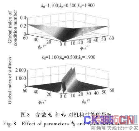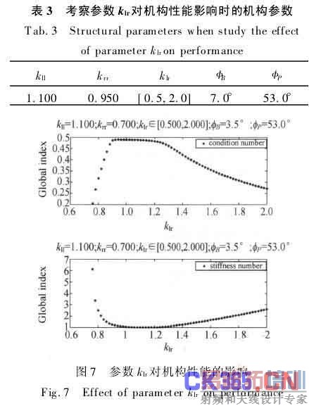 由图7可知,性能指标在区间[0.8,1.9]内较好。klr较小时,刚度性能较差,klr<0.8时,性能急剧恶化(数值过大,未标出);klr<0.7时,无法与其他参数配合组成机构。任给其他参数组合,参数klr对运动精度性能和刚度性能等都有近似的影响规律,图略。
