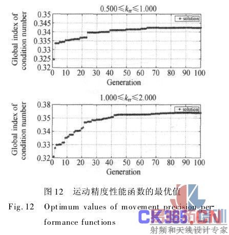 1≤krr≤2时,统一性能函数的最优值为3.732;0.5≤krr≤1时,统一性能函数的最优值为3.915。根据有约束优化数学模型(14),1≤krr≤2时统一性能函数的最优值为全局最优解。比较表7、8,可以看出,1≤krr≤2时性能指标的最优值优于0.5≤krr≤1时各性能指标的最优值,其中,运动精度性能指标增加约0.7%,刚度性能指标减少约4.0%。