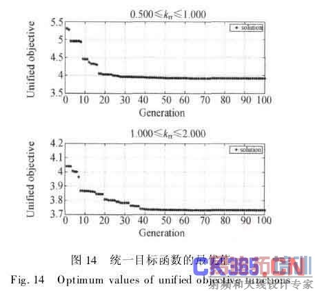 然后,得到统一目标函数的最优值。经过100次遗传迭代,最优值的变化情况见图14。最优值及对应的机构参数值见表7、8。